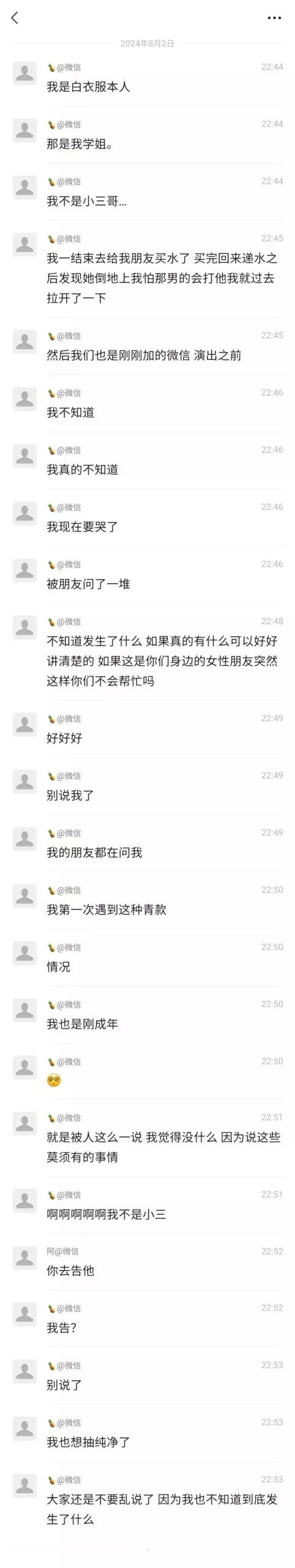 事件正主之一,也就是那位被传是小三的白衣小哥,其实是女主的学弟,在毫不知情的、不知道这位学姐其实是绿茶婊的前提下陪着学姐来看演唱会,结果无辜被牵连进去成为了年度最冤最无辜的被小三第一人