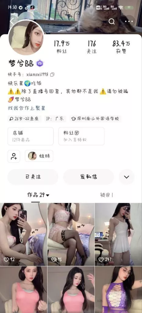 快手上拥有18万粉丝的网红梦兮BB,其主页内容让人误以为进入了一个成人网站。她的日常作品通常都是各种大胆擦边的内容,游走在诱惑的边缘。此外,最近流出的一段视频显示她在私密场合一对一进行果聊,尺度颇大。