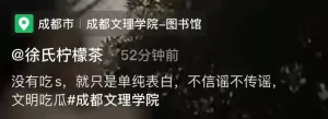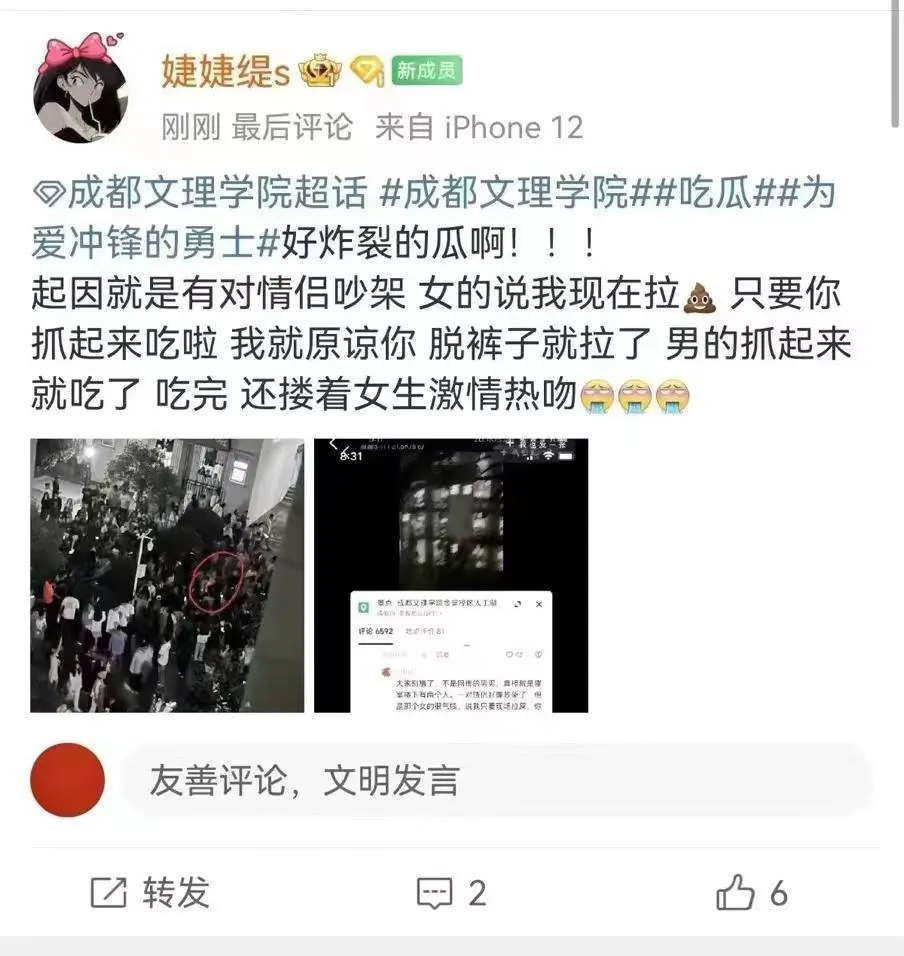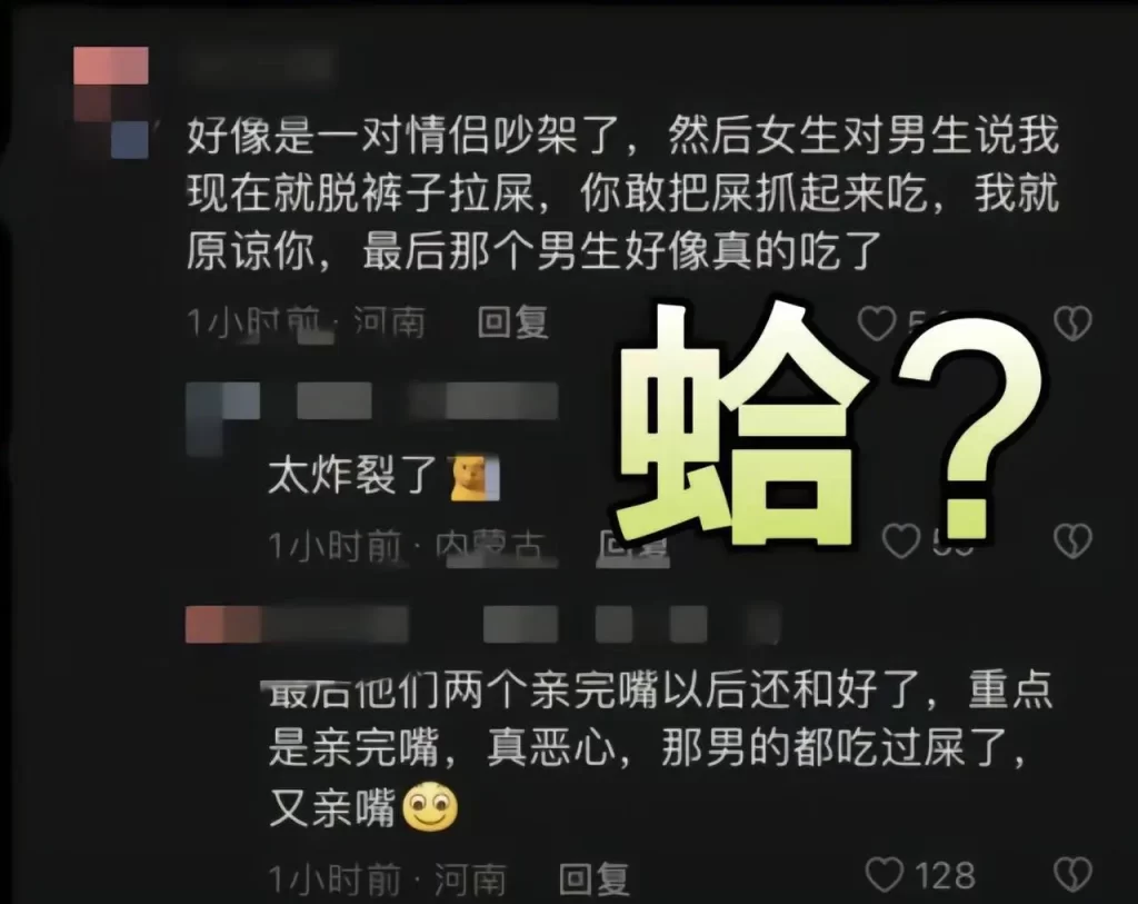 据说成都文理学院 ,因为男女朋友吵架,女的让男的吃屎,结果女生当场拉屎,男生当场抓起来吃,另外还有以下版本